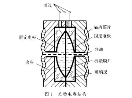 差動(dòng)電容式壓力變送器由測量部分和轉(zhuǎn)換放大電路組成。差分電容式壓力變送器的測量部分通常采用差分電容器結(jié)構(gòu),如圖1所示。