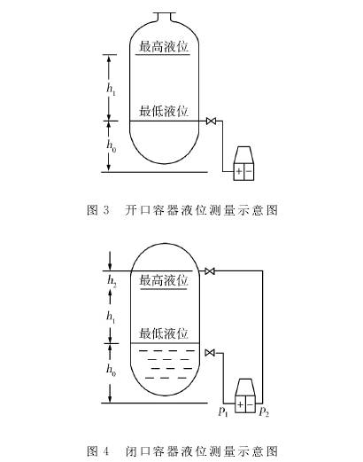 通過測量靜壓力來測量容器液位的靜壓力液位計(jì)可分為兩類:用于測量打開的容器的液位的壓力液位計(jì),如圖3所示;用于測量打開的容器的液位的壓力水平計(jì)。用于測量密閉容器型液位計(jì)液位的壓差,如圖4所示。
